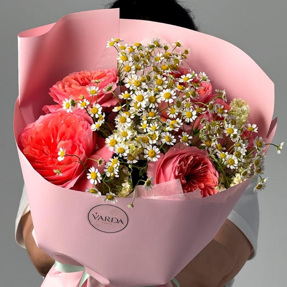 Флористы из студии "Varda Flowers" подобрали свежие и красивые цветы для создания букета, который наполнен положительными эмоциями и любовью. Они тщательно расположили каждый цветок в букете, учитывая его форму и цветовую гамму, чтобы достичь наилучшего гармоничного и красивого результата.